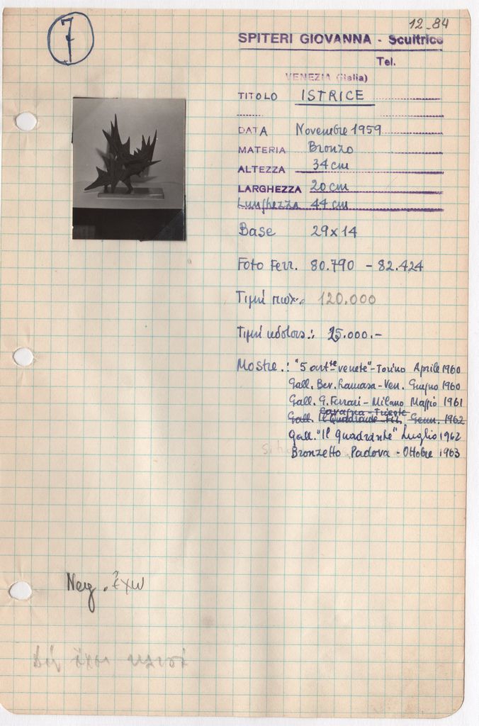 Απόκομμα, χαρτί, μία όψη, 21×14 εκ., επικολλημένο σε φύλλο χαρτιού Α4. Φόρμα καταγραφής στοιχείων έργου, όπου είναι επικολλημένη φωτογραφία του έργου, α/μ, φωτογραφικό χαρτί, 4×3,5 εκ. και σφραγίδα, στα ιταλικά, όπου συμπληρώνονται χειρόγραφα τα στοιχεία του έργου, στα ιταλικά.