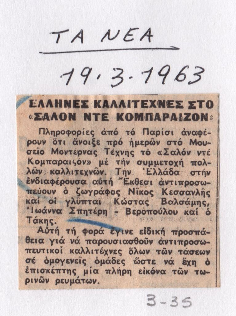 Απόκομμα, έντυπο, στα ελληνικά, χαρτί, 4,5×4,5 εκ., επικολλημένο σε φύλλο χαρτί Α4. Αναφορά στην έκθεση “Comparaisons 63” που έλαβε χώρα στο Παρίσι τον Μάρτιο του 1963. Στο χαρτί, επιγραφή, στα ελληνικά.