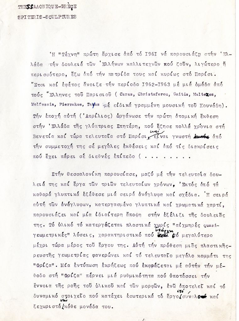 Κείμενο, δακτυλόγραφο, στα ελληνικά, χαρτί, 2 σελίδες, 29×20 εκ., επικολλημένο σε φύλλο χαρτί Α4. Αναφορά στην έκθεση της Ιωάννας Σπητέρη που έλαβε χώρα στη Θεσσαλονίκη το 1963.