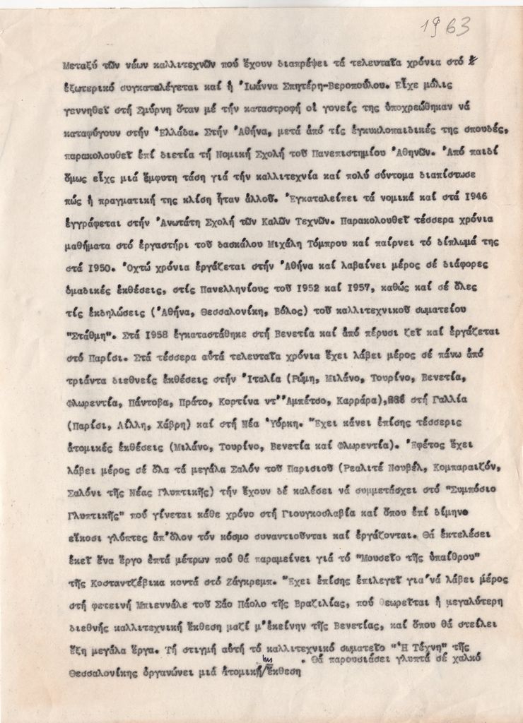 Κείμενο, δακτυλόγραφο, στα ελληνικά, χαρτί, 2φφ, 27×20 εκ. Αναφορά στην καλλιτεχνική πορεία της Ι.Βεροπούλου-Σπητέρη. Στο χαρτί, επιγραφή.