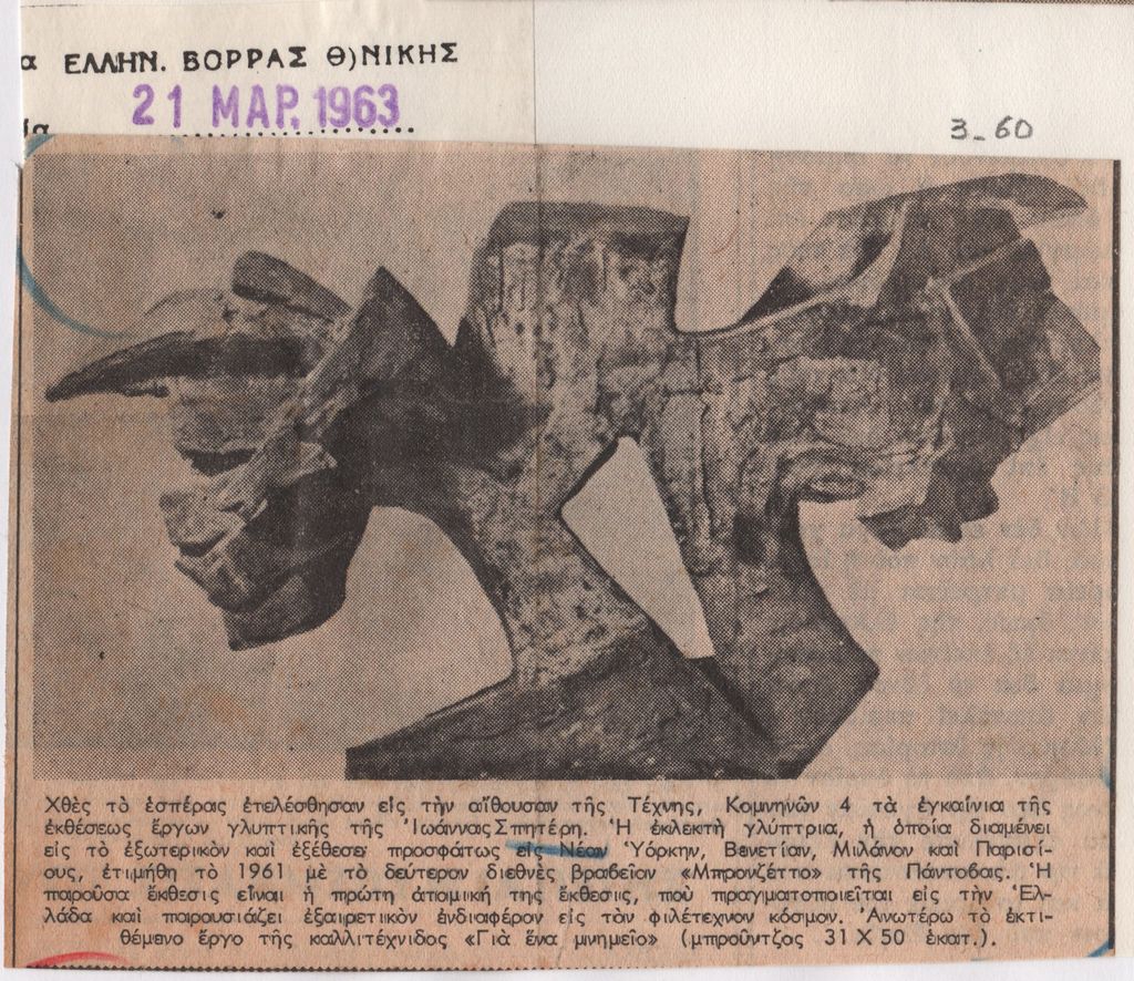 Απόκομμα εντύπου, στα ελληνικά, χαρτί, 10×13 εκ., επικολλημένο σε φύλλο χαρτί Α4. Αναφορά στα εγκαίνια της έκθεση της Ι. Βεροπούλου-Σπητέρη, που έλαβε χώρα στη Θεσσαλονίκη το 1963. Στο χαρτί, πάνω αριστερά, απόκομμα εταιρείας αποδελτίωσης.