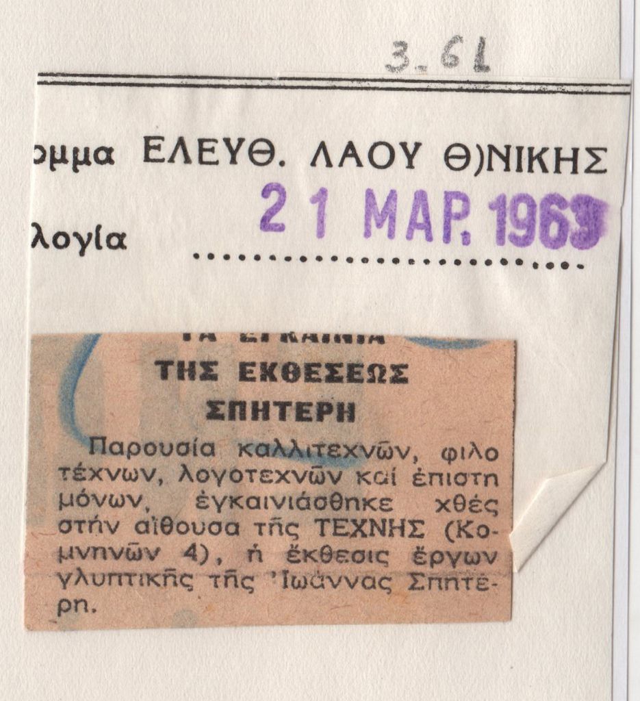 Απόκομμα εντύπου, στα ελληνικά, χαρτί, 3×5 εκ., επικολλημένο σε φύλλο χαρτί Α4. Αναφορά στα εγκαίνια της έκθεση της Ι. Βεροπούλου-Σπητέρη, που έλαβε χώρα στη Θεσσαλονίκη το 1963. Στο χαρτί, πάνω αριστερά, απόκομμα εταιρείας αποδελτίωσης.
