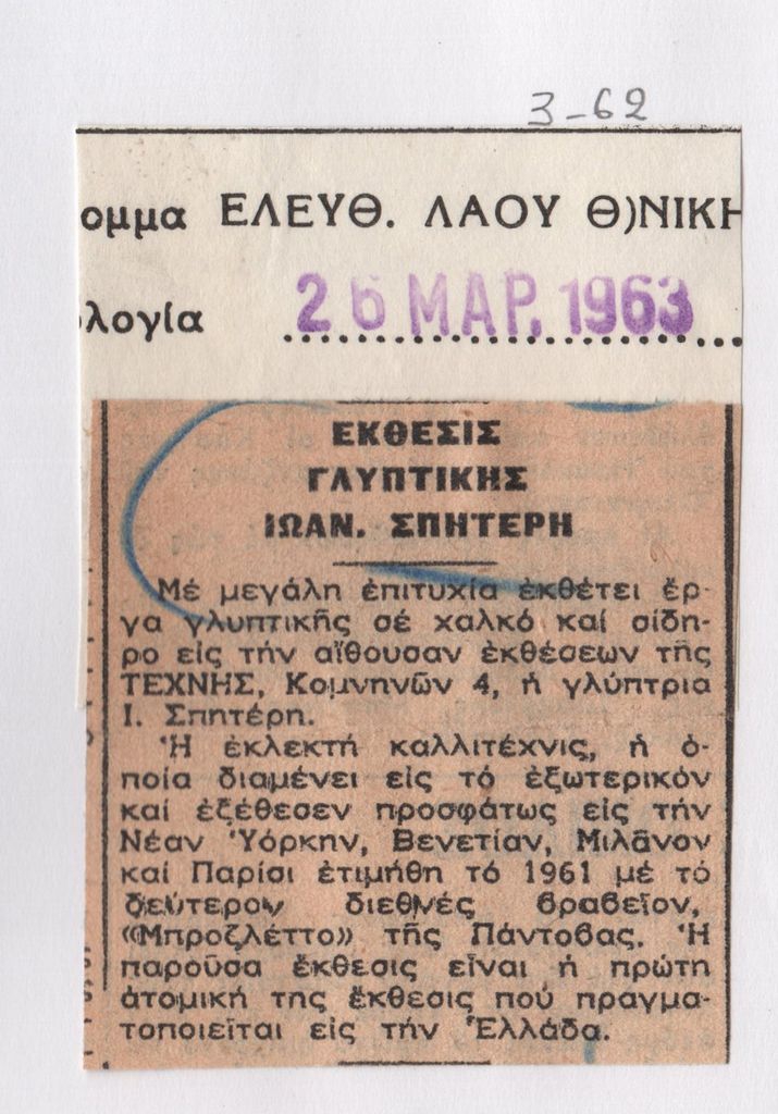 Απόκομμα εντύπου, στα ελληνικά, χαρτί, 5,5×5,5 εκ., επικολλημένο σε φύλλο χαρτί Α4. Αναφορά στην έκθεση της Ι. Βεροπούλου-Σπητέρη, που έλαβε χώρα στη Θεσσαλονίκη το 1963. Στο χαρτί, πάνω αριστερά, απόκομμα εταιρείας αποδελτίωσης.