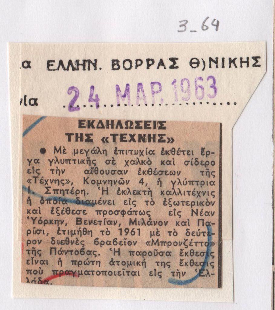 Απόκομμα εντύπου, στα ελληνικά, χαρτί, 3,5×4,5 εκ., επικολλημένο σε φύλλο χαρτί Α4. Κριτική της έκθεσης της Ι. Βεροπούλου-Σπητέρη, που έλαβε χώρα στη Θεσσαλονίκη το 1963. Στο χαρτί, πάνω αριστερά, απόκομμα εταιρείας αποδελτίωσης.