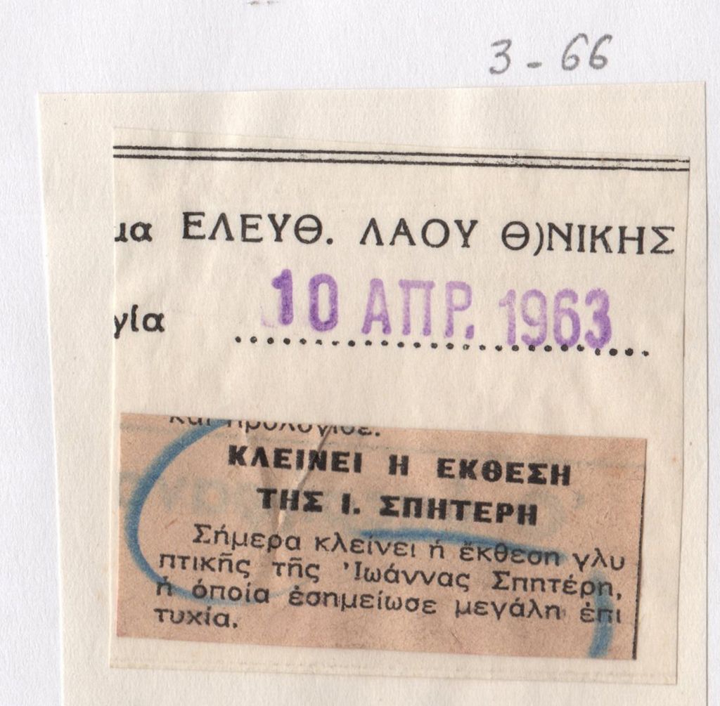 Απόκομμα εντύπου, στα ελληνικά, χαρτί, 2×5 εκ., επικολλημένο σε φύλλο χαρτί Α4. Αναφορά στην ολοκλήρωση της έκθεσης της Ι.Βεροπούλου-Σπητέρη στην Θεσσαλνίκη το 1963. Στο χαρτί, πάνω αριστερά, απόκομμα εταιρείας αποδελτίωσης.