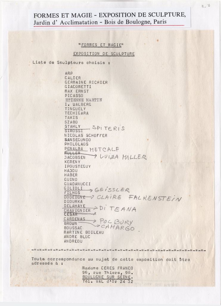 Κείμενο, δκατυλόγραφο, στα γαλλικά, χαρτί, μία όψη, 25×20 εκ., επικολλημένο σε φύλλο χαρτί Α4. Παρατίθεται κατάλογος των καλλιτεχνών που συμμετέχουν στην έκθεση Forme et magie. Στο χαρτί, επικολλημένη, έντυπη λεζάντα, στα γαλλικά: Formes et magie-exposition de sculpture, Jardin d’ Acclimatation-Bois de Boulogne, Paris. Στο χαρτί, επιγραφές, στα γαλλικά.