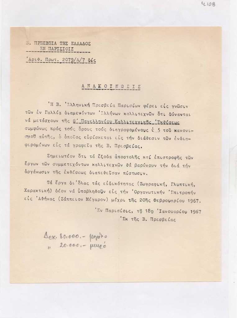 Ανακοίνωση της Ελληνικής Πρεσβείας Παρισιού προς τους Έλληνες καλλιτέχνες κατοίκους Παρισιού, για συμμετοχή τους στη Β’ Πανελλήνιο Καλλιτεχνική Έκθεση