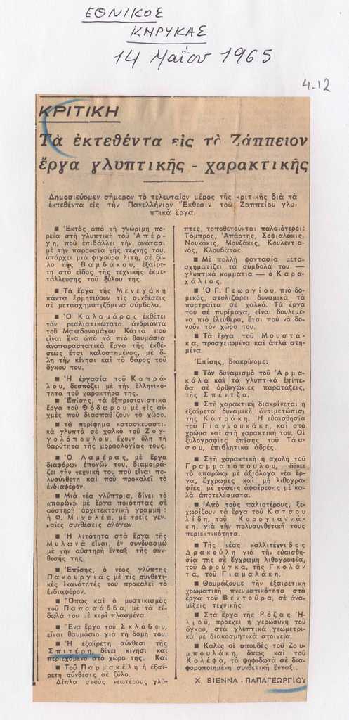 Απόκομμα, έντυπο, στα ελληνικά, χαρτί, 21×9,5 εκ. επικολλημένο σε φύλλο Α4, όπου επιγραφή στα ελληνικά. Αναφορά στην συμμετοχή της Ιωάννας Βεροπούλου-Σπητέρη στην 8η Πανελλήνιο Καλλιτεχνική Έκθεση.