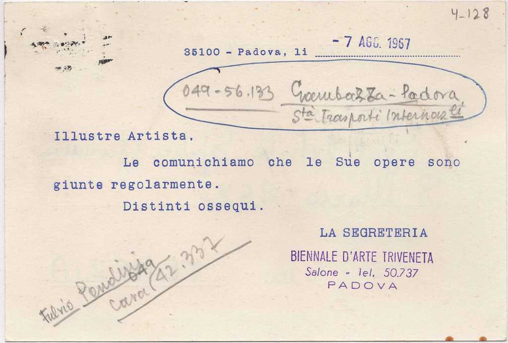 Έντυπο απεσταλμένο στην Ι. Σπητέρη, αναφορικά με έργο της με το οποίο συμμετέχει στην “17a Biennale d’ Arte Triveneta & 7o Concorso Internazionale del Bronzetto”