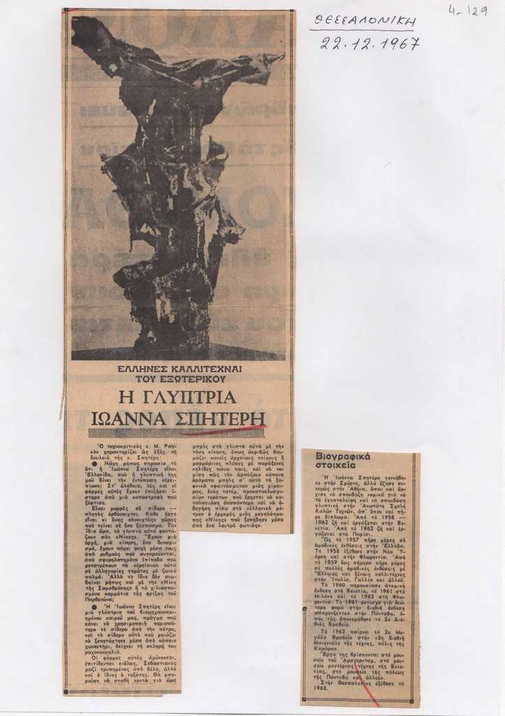 Απόκομμα, έντυπο, στα ελληνικά, χαρτί, 2 τμήματα, 28,5×5 εκ., επικολλημένα σε φύλλο Α4, όπου επιγραφή στα ελληνικά. Αναφορά στην Ιωάννα Βεροπούλου-Σπητέρη, με αφορμή τη συμμετοχή της στην “17a Biennale d’ Arte Triveneta & 7o Concorso Internazionale del Bronzetto”.