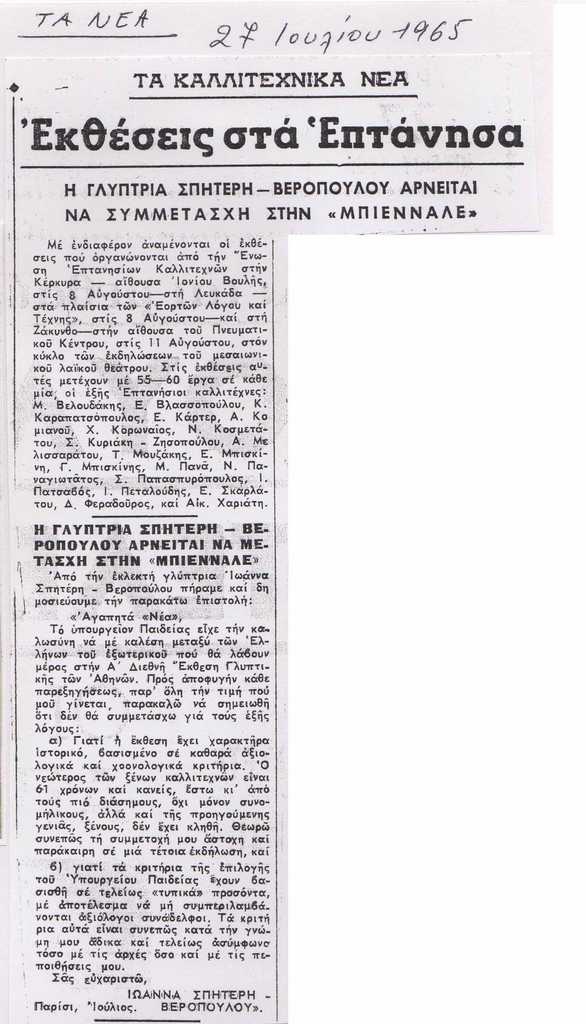 Τα Καλλιτεχνικά Νέα. Εκθέσεις στα Επτάνησα. Η γλύπτρια Σπητέρη-Βεροπούλου αρνείται να συμμετάσχη στην «Μπιεννάλε»