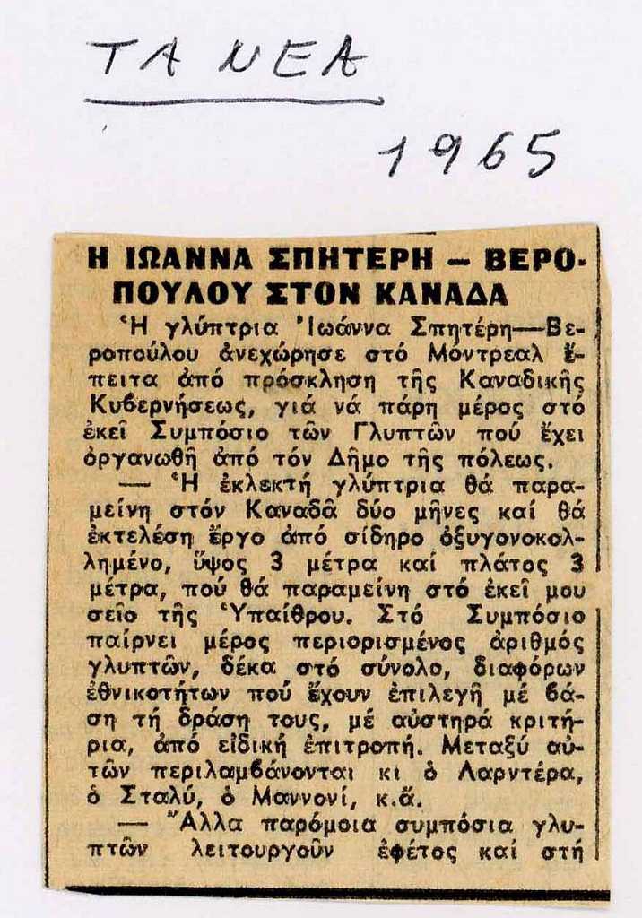 Απόκομμα, έντυπο, στα ελληνικά, χαρτί, 2 τμήματα, 6×5 εκ. και 7×4,5 εκ., επικολλημένα σε φύλλο Α4 μαζί με άλλα δύο τεκμήρια. Αφορά την συμμετοχή της Ι. Βεροπούλου-Σπητέρη στο Συμπόσιο Γλυπτικής στον Καναδά.