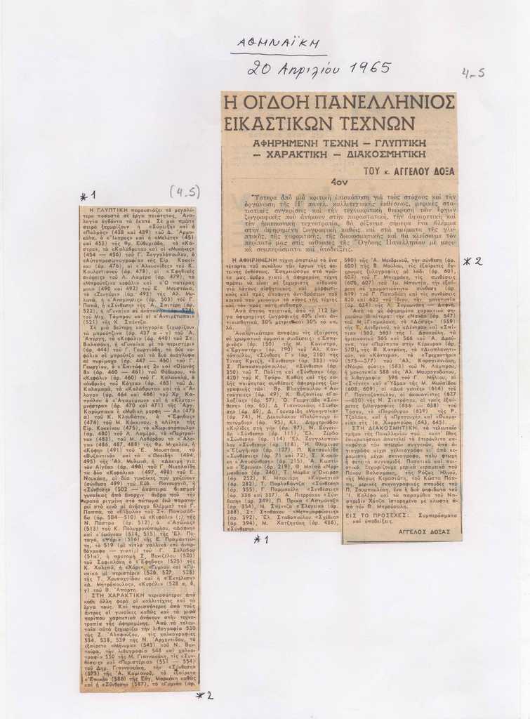 Απόκομμα, έντυπο, στα ελληνικά, χαρτί, 2 τμήματα, 18,5×10 εκ. και 20×5 εκ., επικολλημένα σε φύλλο χαρτί Α4, όπου επιγραφή, στα ελληνικά. Αναφορά στην συμμετοχή της Ιωάννας Βεροπούλου-Σπητέρη στην 8η Πανελλήνιο Καλλιτεχνική Έκθεση.