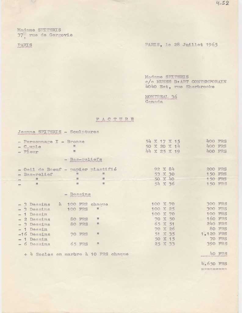 Τιμολόγιο, δακτυλόγραφο, στα γαλλικά, χαρτί, 23×20,5 εκ., επικολλημένο σε φύλλο Α4. Αφορά την αξία έργων της Ι. Σπητέρη τα οποία παρουσιάζει σε έκθεση γλυπτικής στο Μουσείο σύγχρονης τέχνης στο Μόντρεαλ.