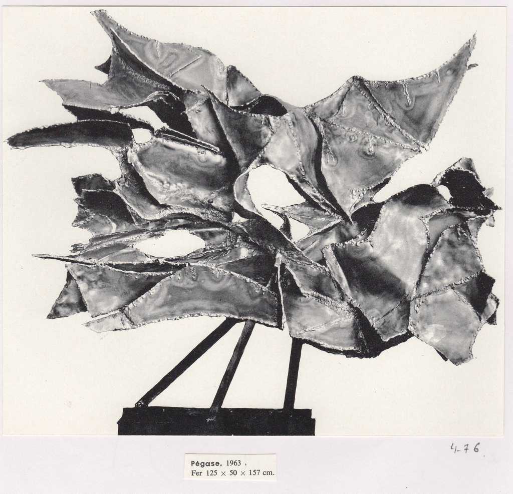 Απόκομμα, έντυπο, χαρτί, 16,5×19,5 εκ., επικολλημένο, μαζί με άλλα δύο τεκμήρια, σε φύλλο Α4. Αναπαραγωγή έργου της Ι. Σπητέρη, α/μ. Στην πίσω όψη, τμήμα λεζάντας. Στο φύλλο επικολλημένο απόκομμα εντύπου με λεζάντα: Pégase, 1963, Fer 125x50x157 cm.