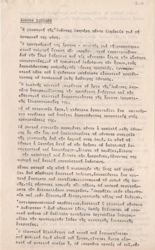 Κείμενο, δακτυλόγραφο, στα ελληνικά, χαρτί, 3 σελίδες, 29,5×18 εκ. Αναφορά στην καλλιτεχνική δημιουργία της Ι.Βεροπούλου-Σπητέρη. Αποτελεί κέιμενο του Μ.Valsecchi μεταφρασμένο στα ελληνικά από την Κ.Σπετσιέρη-Beschi.