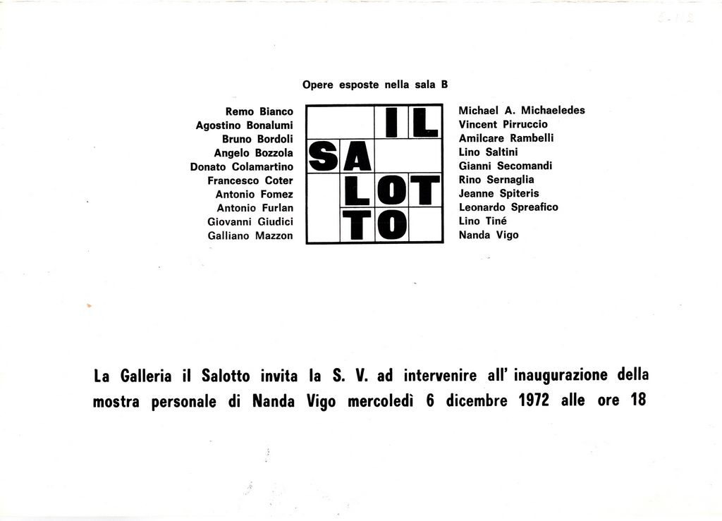 Έντυπο, στα ιταλικά, χαρτί ιλουστρασιόν, 46×33,5 εκ. Αναφορά στην ατομική έκθεση της Nanda Vigo που έγινε στο Μιλάνο το 1972 και συμμετέχουν και άλλοι καλλιτέχνες μεταξύ των οποίων και η Ι.Βεροπούλου-Σπητέρη.