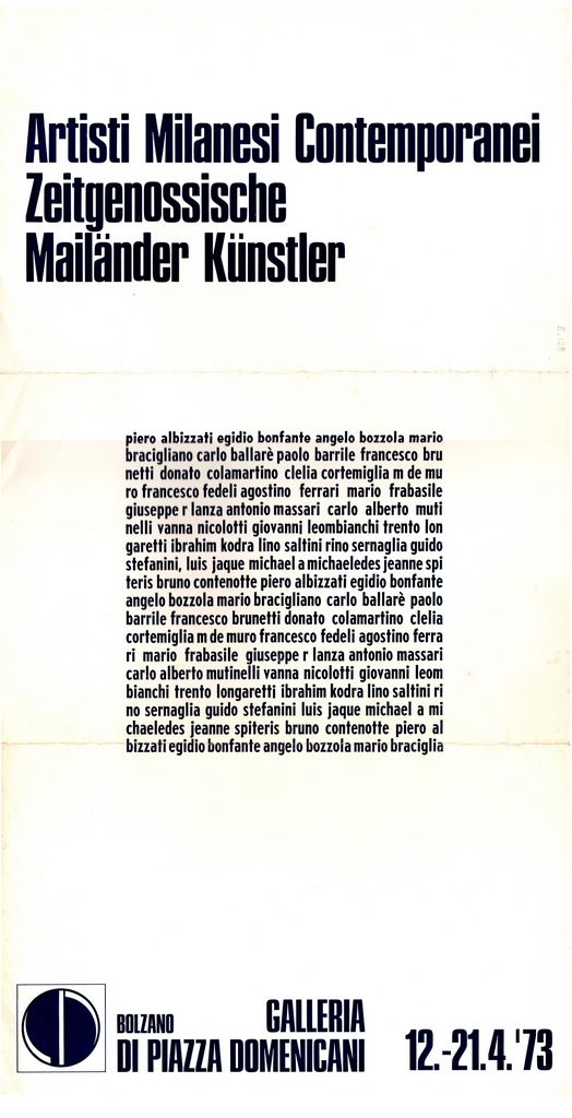 Έντυπο, στα ιταλικά, χαρτόνι, μία όψη, 50×26 εκ. Αναφορά στην έκθεση που έλαβε χώρα στο Μπολζάνο το 1973 και σύντομος κατάλογος συμμετεχόντων καλλιτεχνών.
