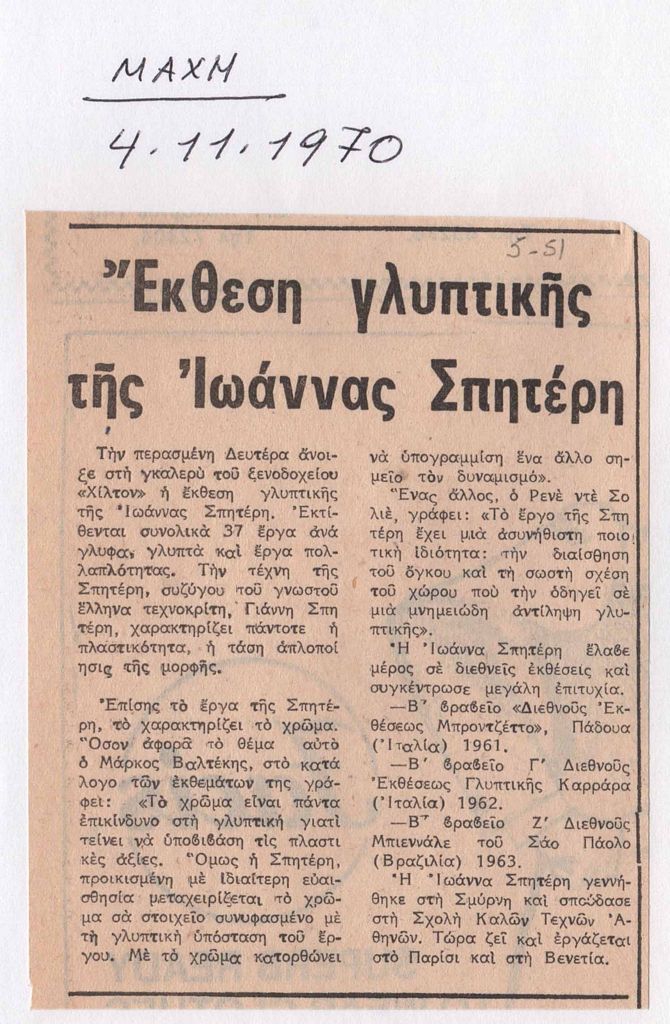Απόκομμα εντύπου, στα ελληνικά, χαρτί, 11,5×9 εκ., επικολλημένο σε φύλλο χαρτί Α4, όπου επιγραφή στα ελληνικά. Άρθρο σχετικά με την έκθεση της Ι.Βεροπούλου-Σπητέρη στην Κύπρο το 1970.