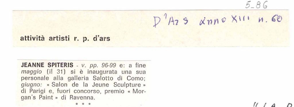Απόκομμα, έντυπο από περιοδικό, χαρτί ιλουστρασιόν, δύο τμήματα: 2×13 εκ. και 2×6 εκ., επικολλημένα σε φύλλο χαρτί Α4. Αναφορά στην ατομική έκθεση έργων της Ιωάννας Βεροπούλου-Σπητέρη στο Como το 1972. Στο απόκομμα, σημείωση, στα ιταλικά.