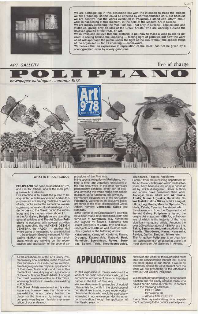 Έντυπο, στα αγγλικά, τετρασέλιδο, χαρτί, 42,0×27,0 εκ. Τεύχος της περιοδικής έκδοσης της γκαλερί Πολύπλανο. Περιέχει πληροφορίες για την ταυτότητα της γκαλερί και τα εξής άρθρα: José Pierre “Simossi”, Denis Schneider “Gaitis” και Τώνης Σπητέρης “Vernadaki” Επίσης, αναπαραγωγές έργων Ελλήνων καλλιτεχνών.