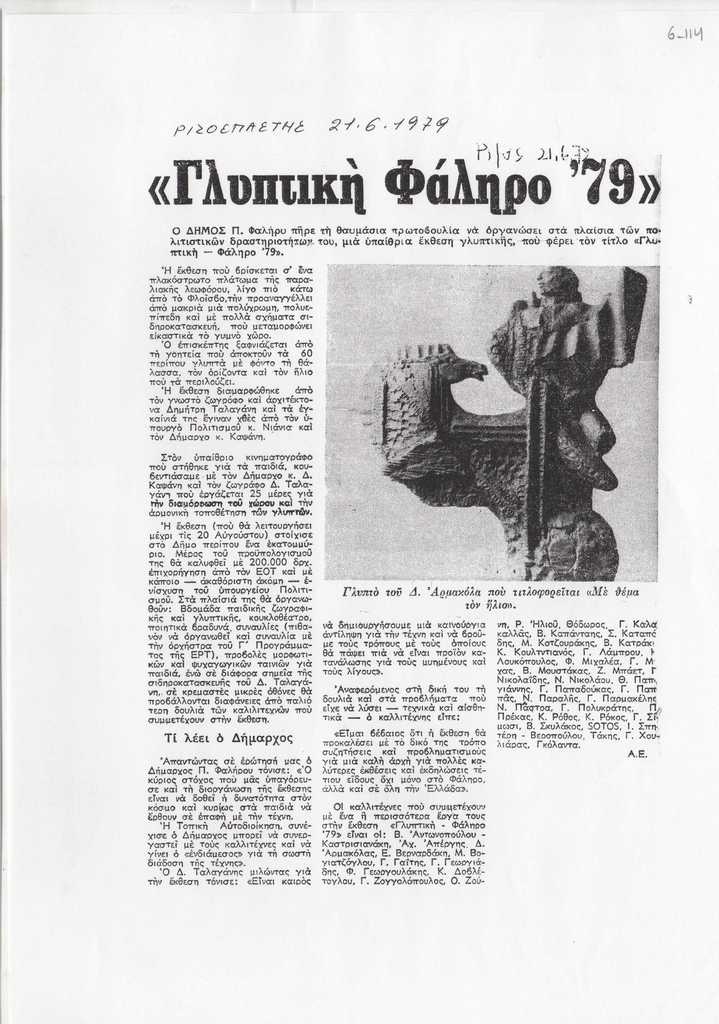 Φωτοαντίγραφο αποκόμματος εντύπου, στα ελληνικά, χαρτί, μία σελίδα, 30×21 εκ. Αναφορά στην έκθεση “Γλυπτική-Φάληρο 1979” στην οποία συμμετέχει και η Ι.Βεροπούλου-Σπητέρη.