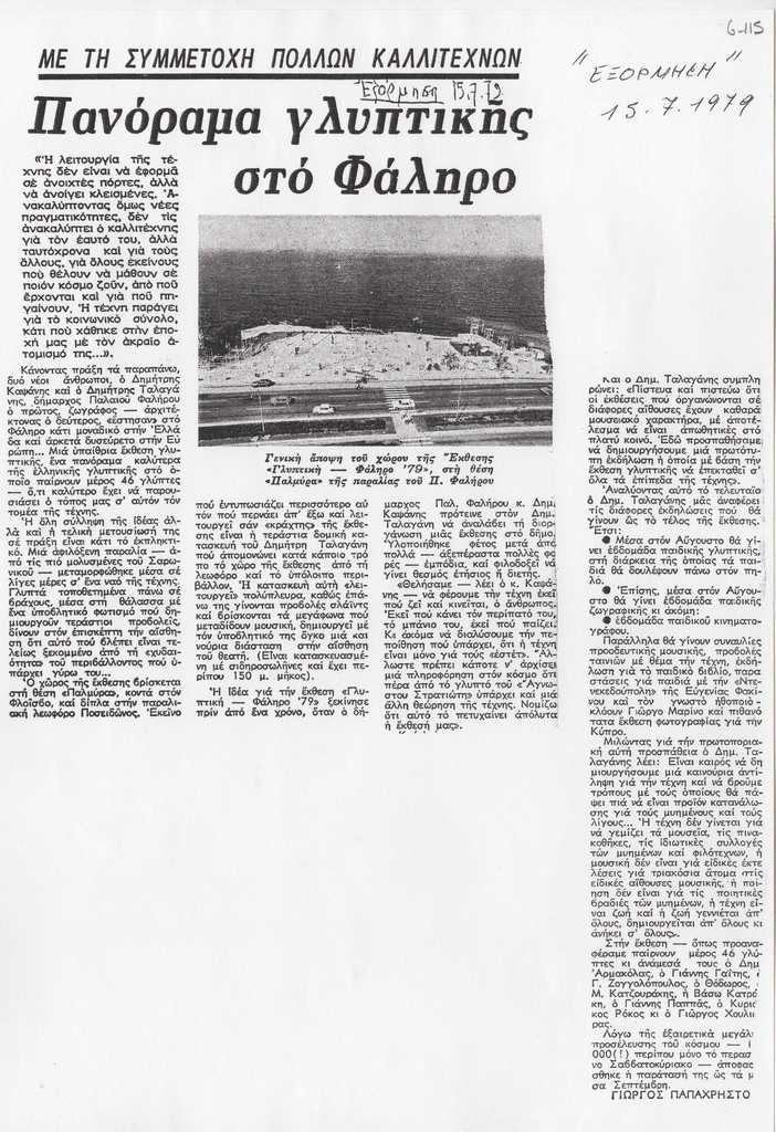 Φωτοαντίγραφο αποκόμματος εφημερίδας, στα ελληνικά, χαρτί, 30×21 εκ. Αναφορά στην έκθεση “Γλυπτική-Φάληρο 1979” στην οποία συμμετέχει και η Ι.Βεροπούλου-Σπητέρη.