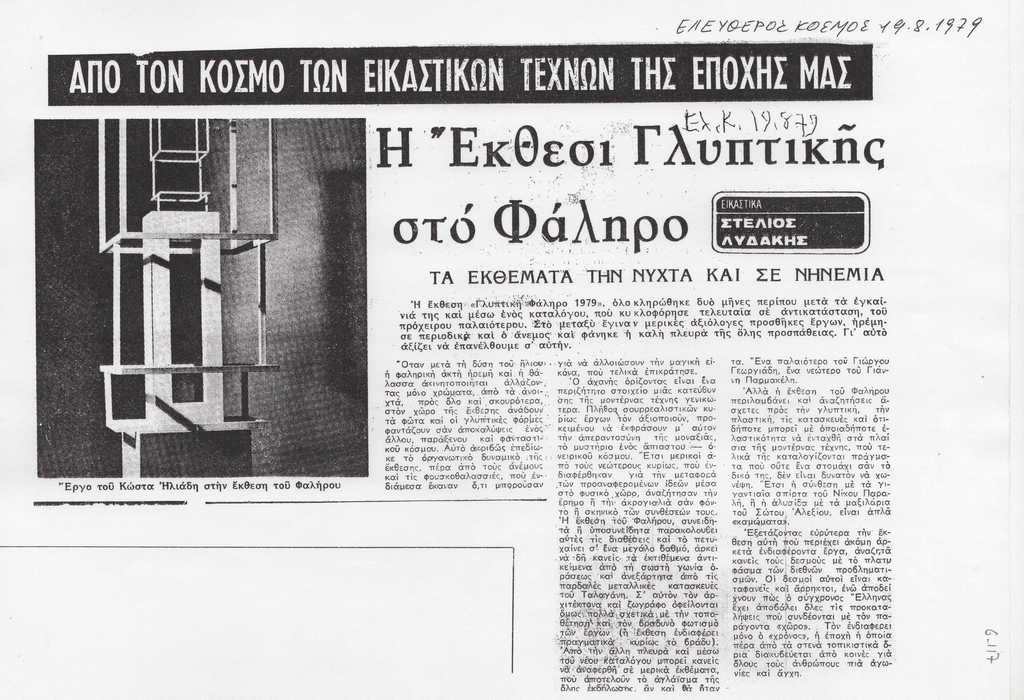 Φωτοαντίγραφο εφημερίδας, στα ελληνικά, χαρτί, μία σελίδα, 21×30 εκ. Αναφορά στην έκθεση “Γλυπτική-Φάληρο 1979” στην οποία συμμετέχει και η Ι.Βεροπούλου-Σπητέρη.