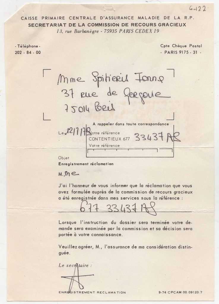 Ταχυδρομικό έντυπο παραλαβής επιστολής, χαρτί, στα γαλλικά, 12/07/1979 (σχετικά με έντυπα της Ιωάννας Βεροπούλου-Σπητέρη για ζητήματα ασφάλισής της στην Γαλλία)