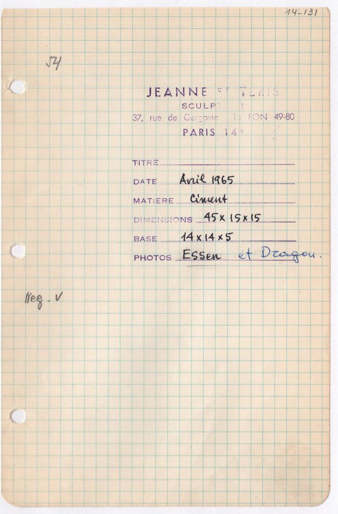 Απόκομμα, χαρτί, μία όψη, 21×14 εκ., επικολλημένο σε φύλλο χαρτιού Α4. Φόρμα καταγραφής στοιχείων έργου και σφραγίδα, στα γαλλικά, όπου συμπληρώνονται χειρόγραφα τα στοιχεία του έργου.