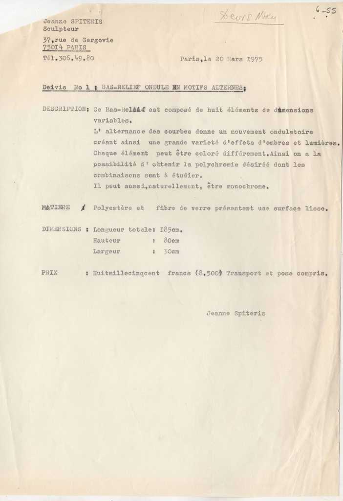 Έγγραφο, δακτυλόγραφο, στα γαλλικά, χαρτί, δύο σελίδες, 29×20 εκ. Αναφορά στοιχείων των έργων της Ι.Βεροπούλου-Σπητέρη.