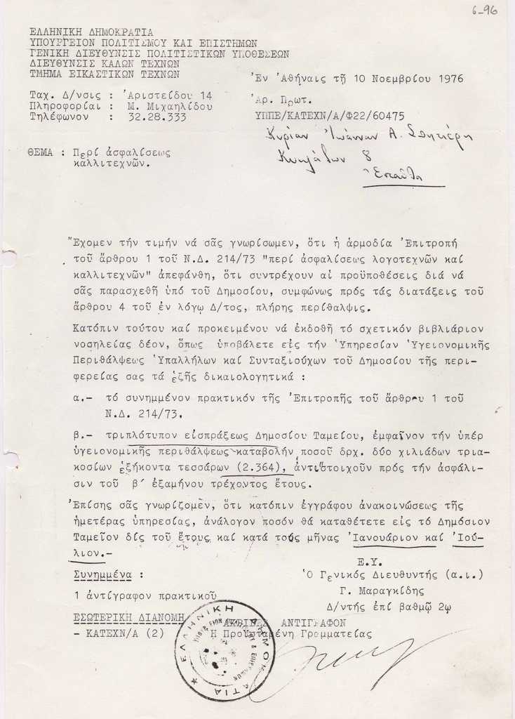 Φωτοαντίγραφο επιστολής, έντυπο, στα ελληνικά, χαρτί, μία όψη, 29×20 εκ., επικολλημένο σε φύλλο χαρτί Α4. Αναφέρεται σε ζητήματα ασφάλισής της καλλιτέχνιδας.