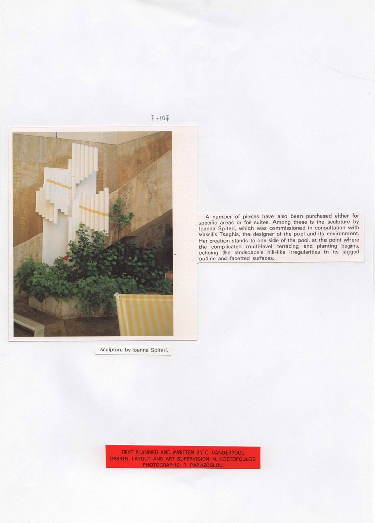 Απόκομμα, έντυπο, στα αγγλικά, χαρτόνι, 12×20 εκ., επικολλημένο σε φύλλο Α4. Περιλαμβάνει σύντομο κείμενο σχετικά με το γλυπτό της Ιωάννας Βεροπούλου-Σπητέρη στο Hotel Athenaeum Intercontinental στην Αθήνα.