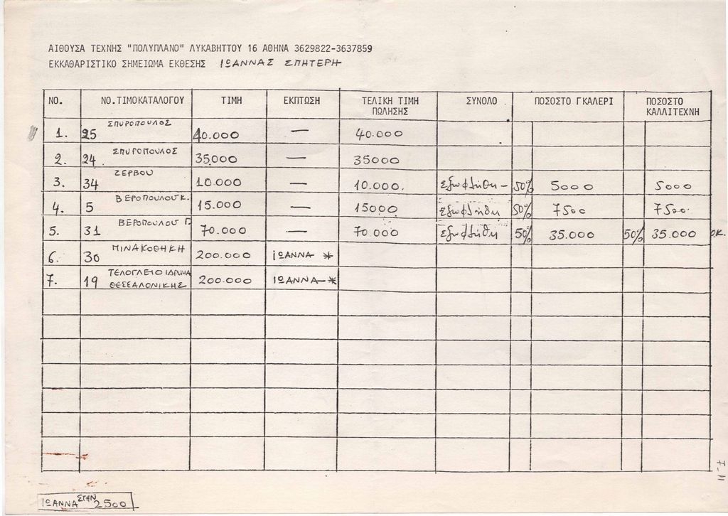 Φωτοαντίγραφο δακτυλόγραφου και χειρόγραφου κειμένου, στα ελληνικά, χαρτί, ένα φύλλο, μία όψη, 29,5×21 εκ. Δακτυλόγραφο, συμπληρωμένο χειρόγραφα. Εκκαθαριστικό σημείωμα της έκθεσης, με οικονομικά στοιχεία από την πώληση των έργων.