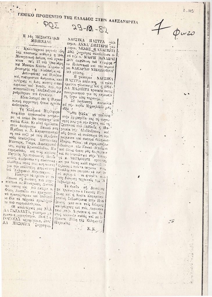 Φωτοαντίγραφο αποκόμματος εφημερίδας, στα ελληνικά, χαρτί, μία όψη, 29,5×21 εκ. Τηλεομοιοτυπία (fax). Αφορά την 14η Biennale της Αλεξάνδρειας το 1982, με αναφορά στην Ιωάννα Βεροπούλου-Σπητέρη. Στο πρωτότυπο υπήρχε επιγραφή, στα ελληνικά: ΦΩΣ 29-10-82