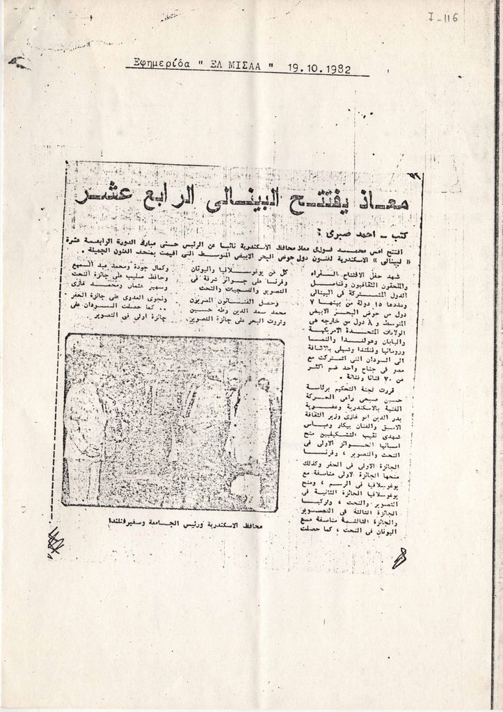 Φωτοαντίγραφο αποκόμματος εφημερίδας, στα αραβικά, χαρτί, μία όψη, 29,5×21 εκ. Τηλεομοιοτυπία (fax). Αφορά την 14η Biennale της Αλεξάνδρειας το 1982.