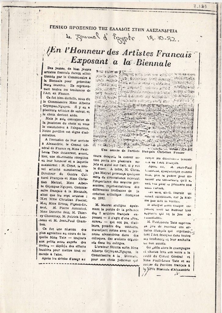 Φωτοαντίγραφο αποκόμματος εφημερίδας, στα γαλλικά, χαρτί, 29,5×21 εκ. Τηλεομοιοτυπία (fax). Αφορά την 14η Biennale της Αλεξάνδρειας το 1982. Στο πρωτότυπο υπήρχε επιγραφή, στα γαλλικά: Le journal d’ Égypte 18-10-82