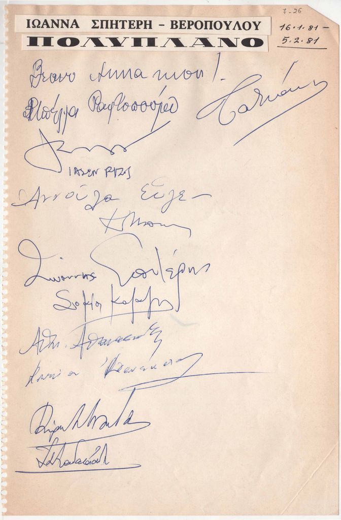 Κείμενο, χειρόγραφο, στα ελληνικά, χαρτί, είκοσι τρία φύλλα, μίας όψης, 29,5×19 εκ. Σχόλια και υπογραφές στο βιβλίο επισκεπτών της έκθεσης της Ι. Σπητέρη στην Αίθουσα Τέχνης “Πολύπλανο”.