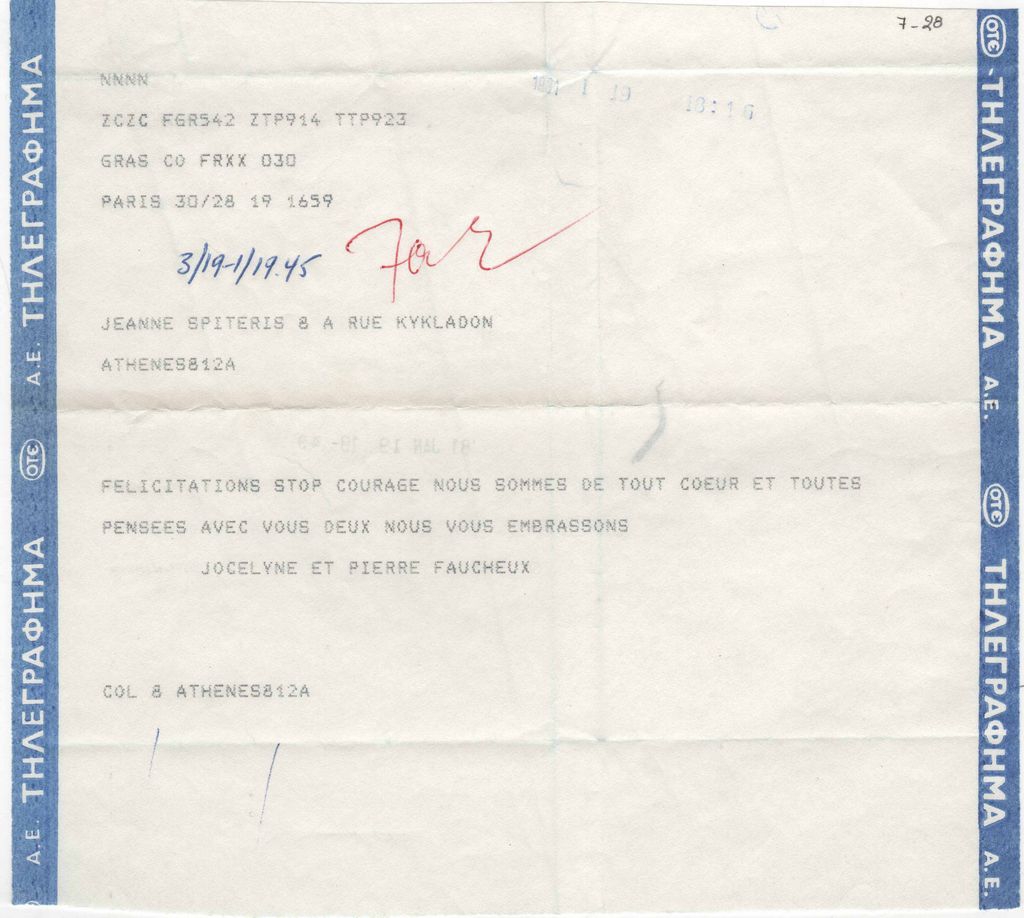 Τηλεγράφημα από τους Jocelyne et Pierre Faucheux προς την Ιωάννα Βεροπούλου Σπητέρη