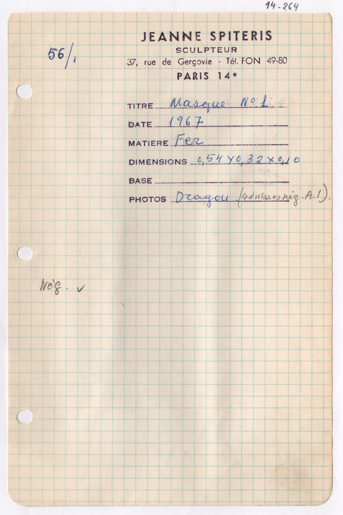 Απόκομμα, χαρτί, μία όψη, 21×14 εκ., επικολλημένο σε φύλλο χαρτιού Α4. Φόρμα καταγραφής στοιχείων έργου και σφραγίδα, στα γαλλικά, όπου συμπληρώνονται χειρόγραφα τα στοιχεία του έργου.