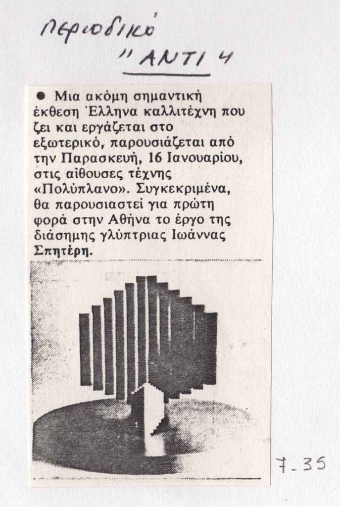Απόκομμα, έντυπο, στα ελληνικά, χαρτί, 8×5 εκ., επικολλημένο σε φύλλο Α4, μαζί με άλλα τέσσερα τεκμήρια, όπου επιγραφή στα ελληνικά. Αναγγελία των εγκαινίων της ατομικής έκθεσης της Ιωάννας Βεροπούλου Σπητέρη στην Αίθουσα Τέχνης “Πολύπλανο” στην Αθήνα, το 1981.
