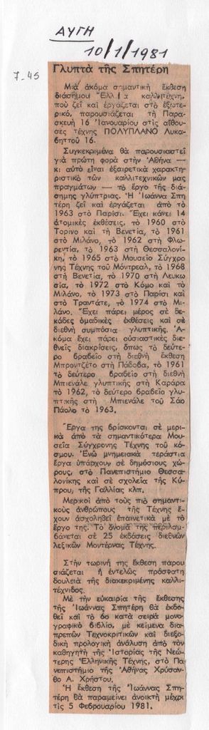 Απόκομμα, έντυπο, στα ελληνικά, χαρτί, 22,5×5 εκ., επικολλημένο σε φύλλο Α4, μαζί με άλλο τεκμήριο, όπου επιγραφή στα ελληνικά. Κριτική για την ατομική έκθεση της Ιωάννας Βεροπούλου-Σπητέρη στην Αίθουσα Τέχνης “Πολύπλανο” στην Αθήνα, το 1981.