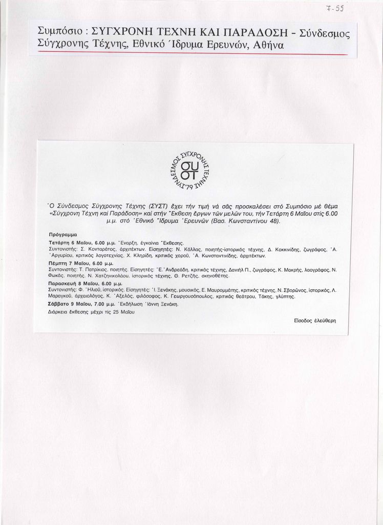 Φωτοαντίγραφο αποκόμματος εντύπου, στα ελληνικά, χαρτί, 11×17,5 εκ., επικολλημένο σε φύλλο Α4. Πρόσκληση στο Συμπόσιο με θέμα “Σύγχρονη Τέχνη και Παράδοση” που διοργάνωσε ο Σύνδεσμος Σύγχρονης Τέχνης καθώς και στην ομαδική έκθεση έργων των μελών του, στην Αθήνα. Περιλαμβάνει το πρόγραμμα και τους εισηγητές του συμποσίου.