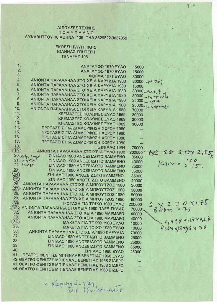 Έντυπο, στα ελληνικά, χαρτί, ένα φύλλο, μία όψη, 29,5×21 εκ. Κατάλογος έργων της έκθεσης, με επιγραφές σχετικές με τις διαστάσεις των έργων.