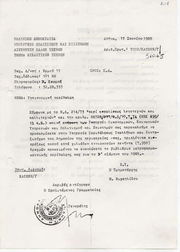 Φωτοαντίγραφο υπηρεσιακού εγγράφου, χαρτί, στα ελληνικά, του Υπουργείου Πολιτισμού, απεσταλμένο προς την Ιωάννα Βεροπούλου-Σπητέρη, αναφορικά με την υγειονομική της περίθαλψη, Αθήνα, 17/06/1985