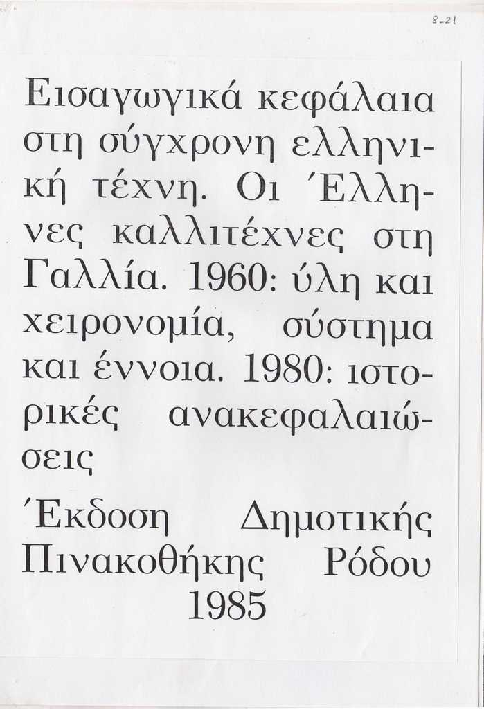 Φωτοαντίγραφο, χαρτί, 25 φφ, στα ελληνικά, αποκόμματος εντύπου, που κυκλοφορεί από την Δημοτική Πινακοθήκη Ρόδου το 1985 στο πλαίσιο της διοργάνωσης Αθήνα-Πολιτιστική Πρωτεύουσα 1985 (Εισαγωγικά κεφάλαια στη σύγχρονη Ελληνική τέχνη. Οι Έλληνες καλλιτέχνες