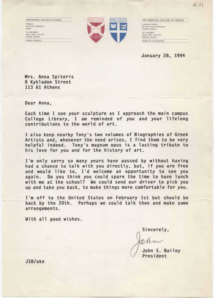 Δακτυλόγραφη επιστολή, χαρτί, στα αγγλικά, απεσταλμένη από τον John S. Bailey, προς την Ιωάννα Βεροπούλου-Σπητέρη, 28/01/1994 (αναφέρεται σε έργο που φιλοτέχνησε για το Deree College στην Αθήνα και στον Τώνη Σπητέρη)