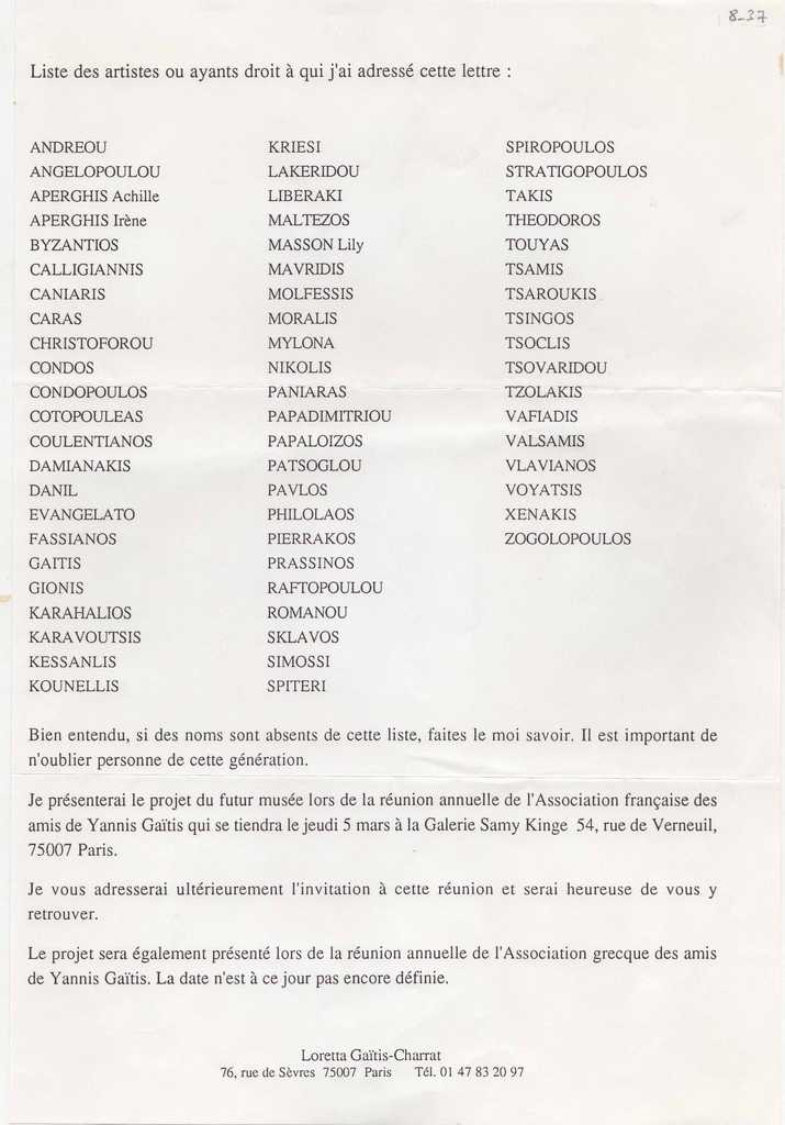 Φωτοαντίγραφο εντύπου, χαρτί, στα γαλλικά, με λίστα καλλιτεχνών στους οποίους η Λορέτα Γαΐτη έστειλε ανοικτή επιστολή ζητώντας την συνδρομή τους στην ίδρυση μουσείου αφιερωμένου στον Γιάννη Γαΐτη στην Ίο. Στο παρόν αναφέρεται σε επικείμενη συνάντηση για ν
