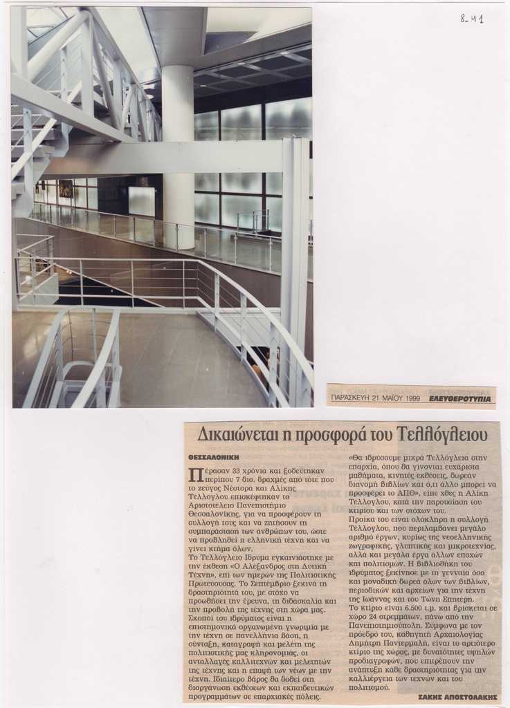 Απόκομμα εντύπου, στα ελληνικά, χαρτί, 12×13,5 εκ., επικολλημένο σε φύλλο χαρτί Α4. Αναφορά στην ολοκλήρωση κατασκευής του κτιρίου του Τελλογλείου Ιδρύματος Τεχνών του ΑΠΘ. Στο χαρτί, επικολλημένη φωτογραφία που απεικονίζει το εσωτερικό του Τελλογλείου, έγχρωμη, φωτογραφικό χαρτί, 17×13 εκ.