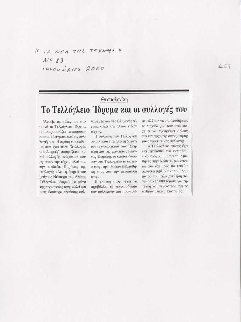 Φωτοαντίγραφο αποκόμματος περιοδικού, στα ελληνικά, χαρτί, μία όψη, 9×13 εκ., επικολλημένο σε φύλλο χαρτί Α4, όπου επιγραφή στα ελληνικά. Αναφροά στα εγκαίνια της πρώτης έκθεσης του Τελλογείου Ιδρύματος και στις συλλογές του.